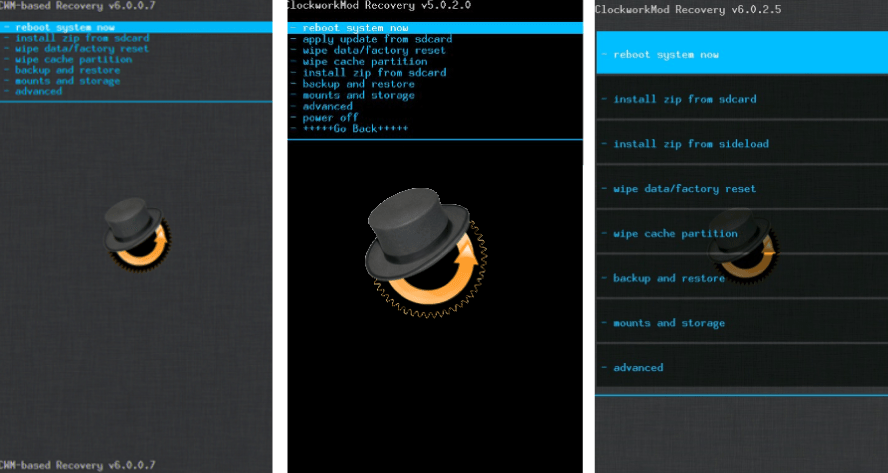 Стоит отметить наличие большого количества версий CWM Recovery, поэтому после входа на различных устройствах можно увидеть несколько отличающийся интерфейс, – фон, оформление, может присутствовать сенсорное управление и т.п. Кроме того могут наличествовать или отсутствовать некоторые пункты меню.