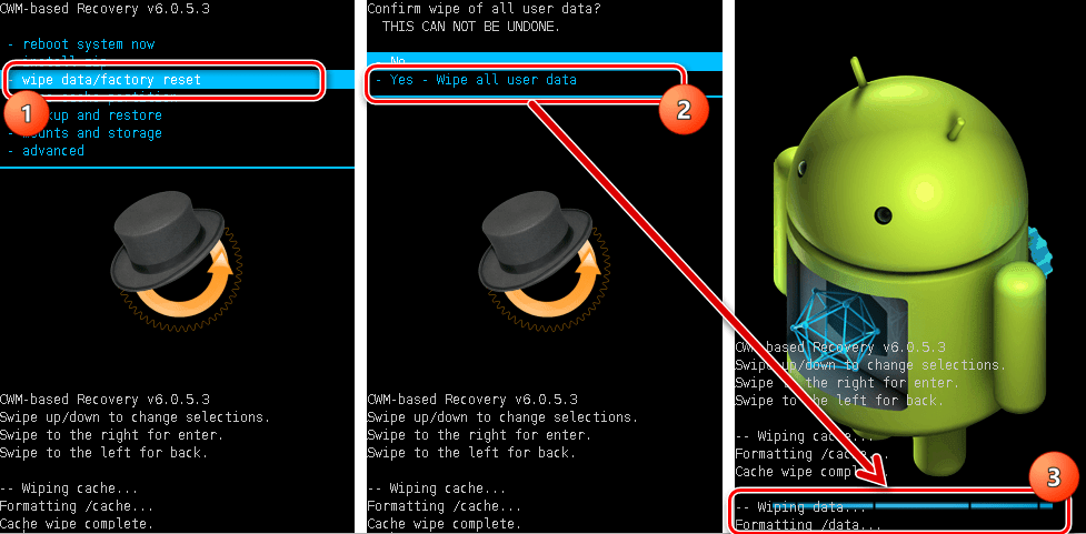 wipe data/factory reset [вайп дата/фектори ресет] — сброс к заводским настройкам и удаление установленных программ и их данных (но не картинок, видео и мелодий).
