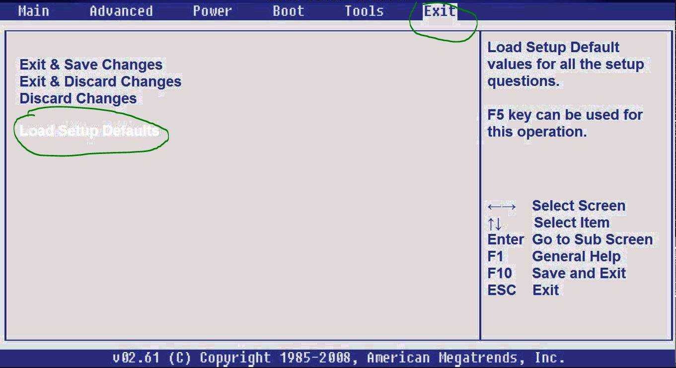 Успешно войдя в BIOS, вам потребуется найти пункт «Load Setup Defaults» или несколько иное, но схожее наименование пункта. Часто подобная функция располагается или в разделе «Exit», или в одном из главных разделов BIOS.
