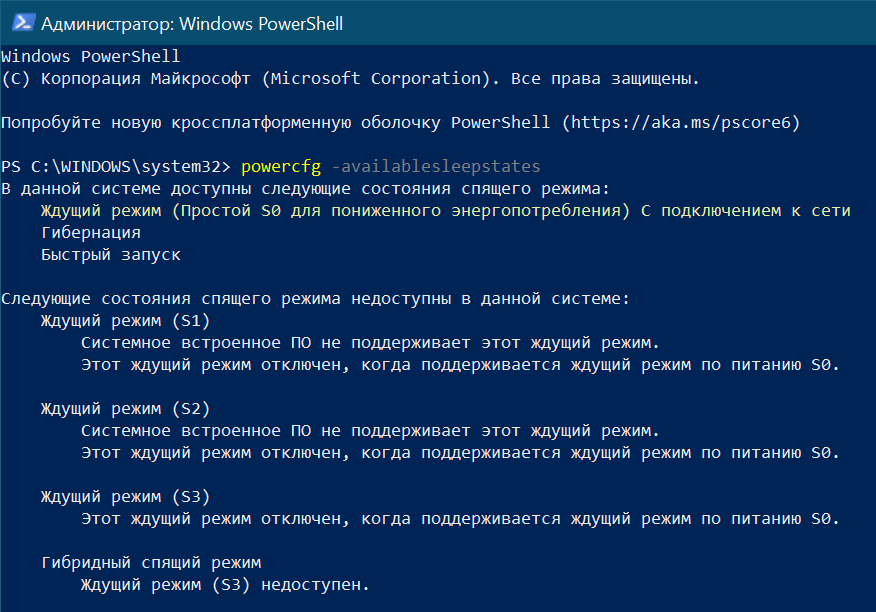 Посмотреть все поддерживаемые режимы своего ПК вы можете командой: powercfg -availablesleepstates На картинке вывод команды на Surface Go. Заодно обратите внимание на полное русское название режима