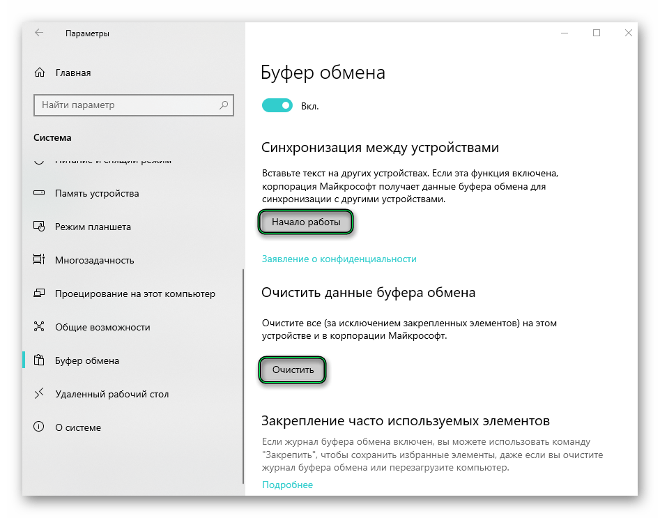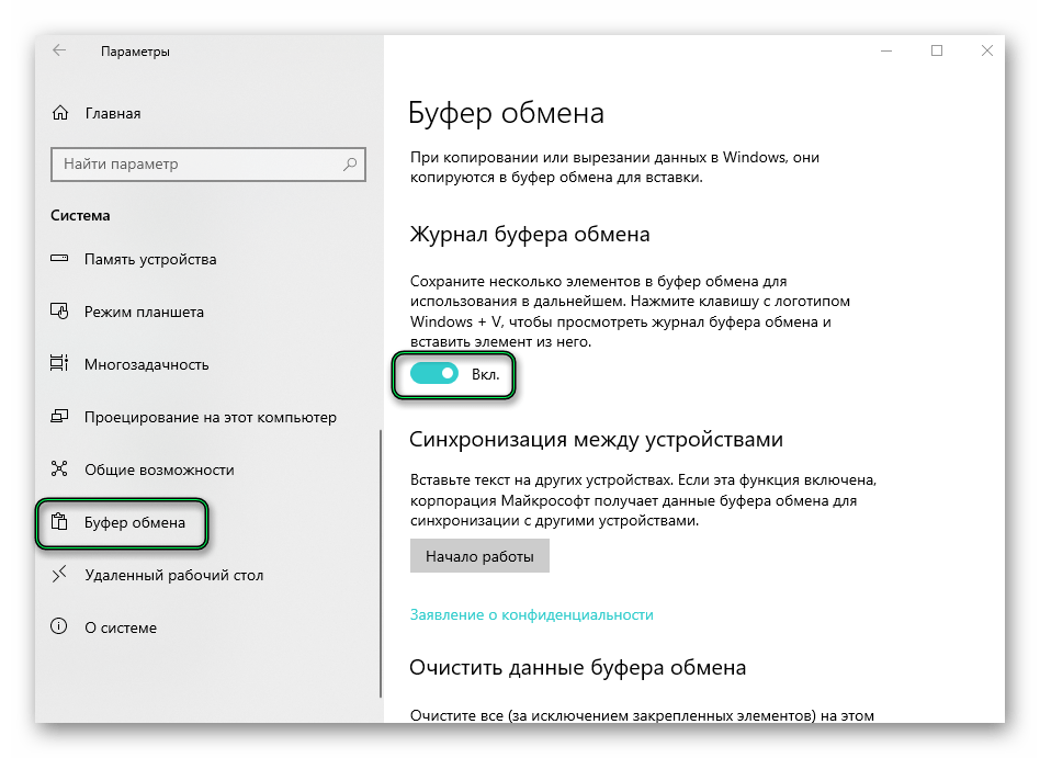Чтобы включить, его откройте Параметры раздел Система. В самом низу будет пункт Буфер обмена.