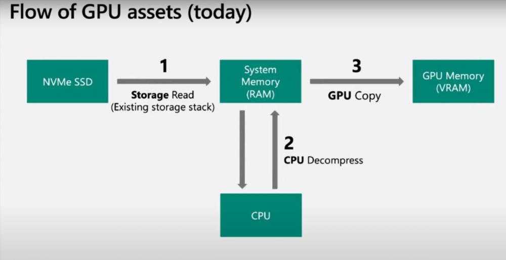 Также изменяется путь, который проходят данные. Сейчас, когда игре требуются данные с накопителя, то они сначала считываются в оперативную память (RAM), потом поступают в процессор (CPU), где выполняется их распаковка (Decompress), потом возвращаются в оперативную память и только потом передаются в видеопамять видеокарты.