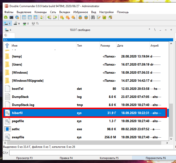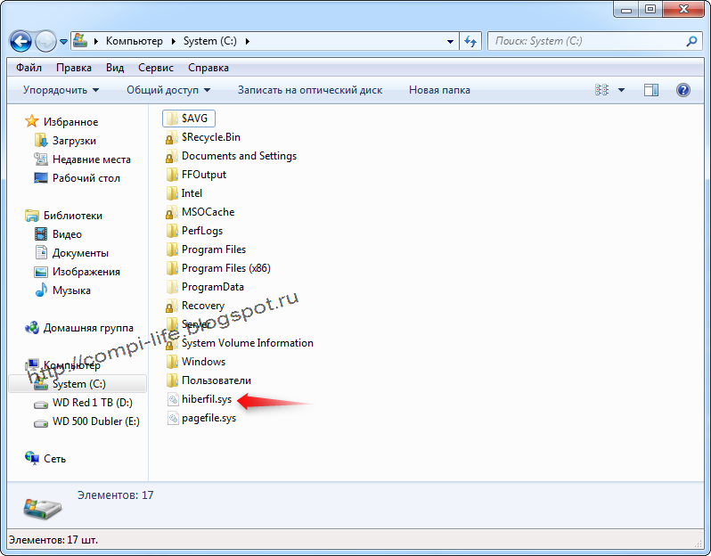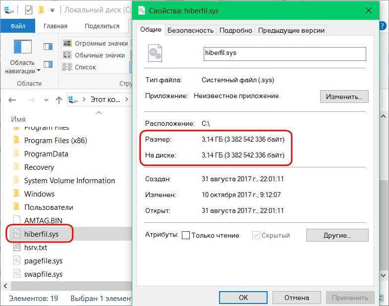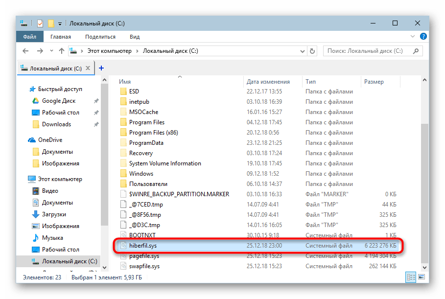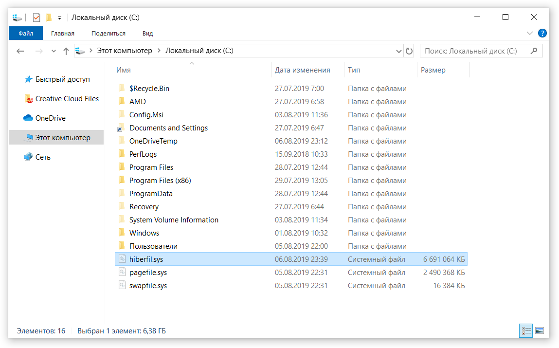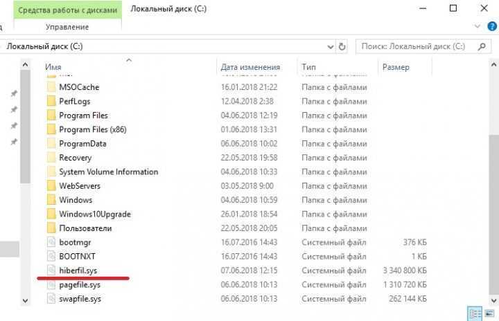 Теперь внутри проводника в корне диска (C:\) можем лицезреть тот самый файл «hiberfil» с расширением «.sys», а также узнать, сколько места он занимает.