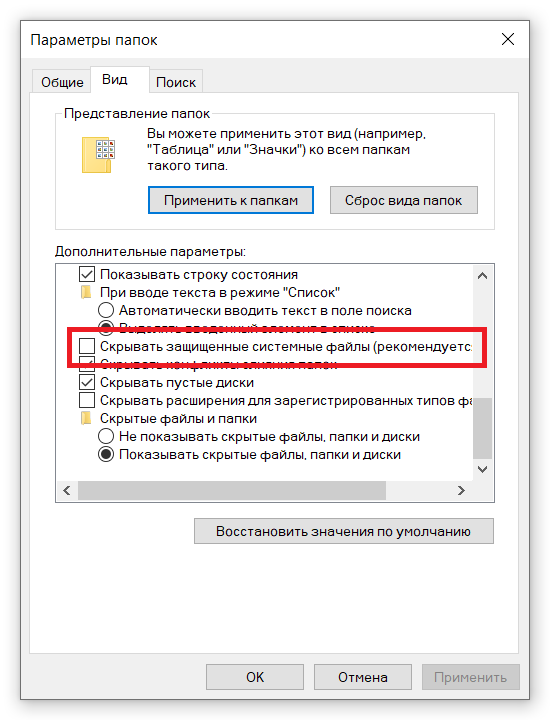 Непосредственно в окошке параметров папок переключаемся на вкладку «Вид» и делаем следующее: • Снимаем галочку сокрытия защищённых системных файлов; • Включаем отображение скрытых элементов; • Жмём внизу «Применить».