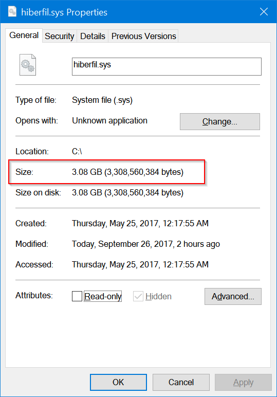 Второй режим — гибернация, в котором Windows полностью записывает все содержимое оперативной памяти на жесткий диск и выключает компьютер. При последующем включении не происходит загрузка системы «с нуля», а загружается содержимое файла. Соответственно, чем больше размер оперативной памяти компьютера или ноутбука, тем больше места hiberfil.sys занимает на диске.