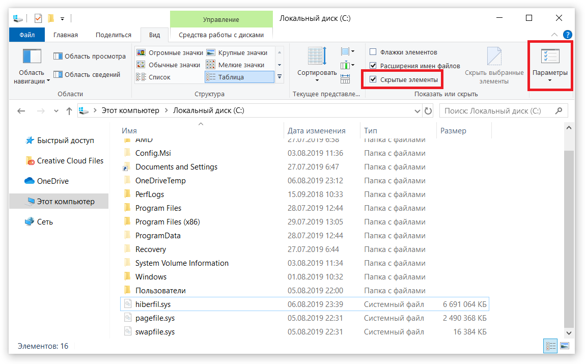 Прежде чем удалять искомый файл, нужно включить функцию отображения скрытых папок и файлов. Иначе отыскать hiberfil.sys не удастся.