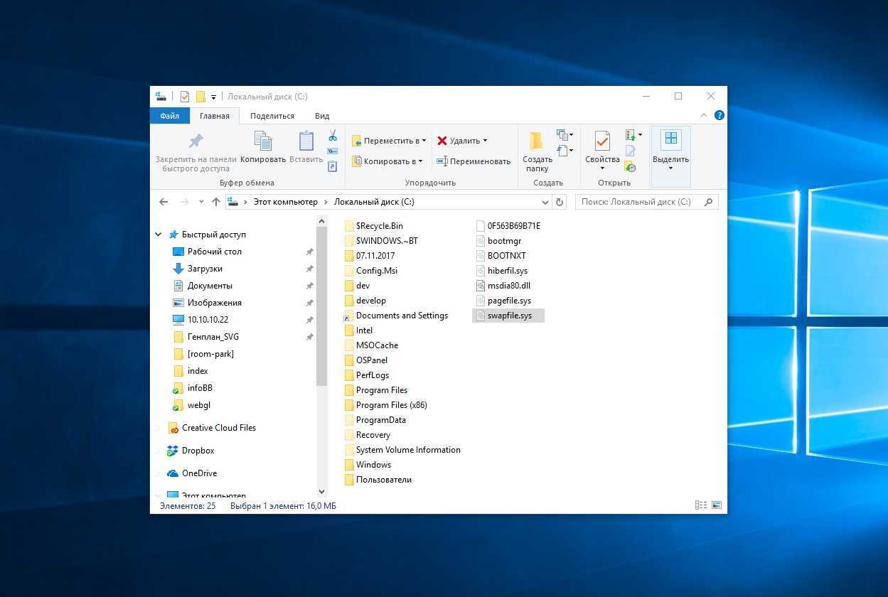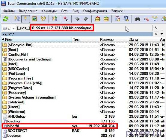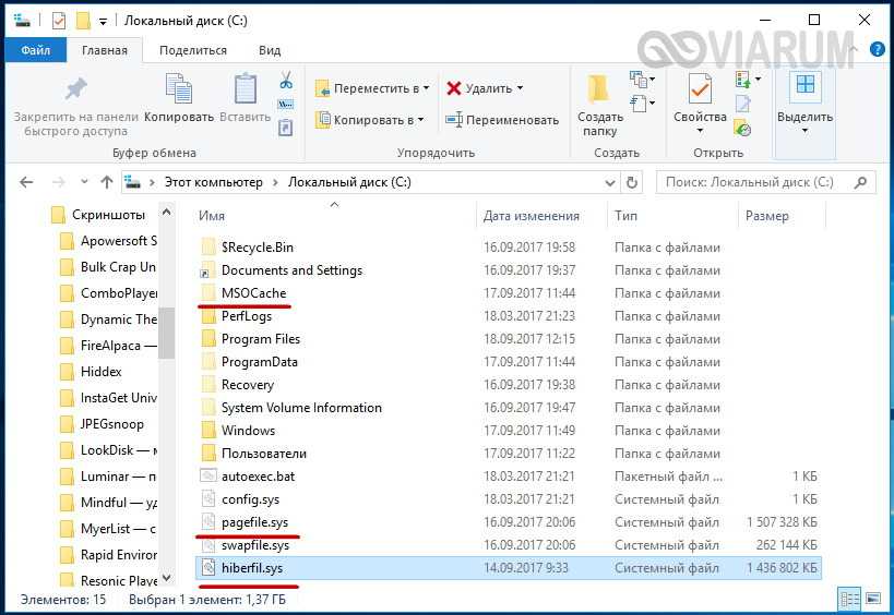 Теперь мы можем проверить, есть ли hiberfil.sys на системном диске или отсутствие свободного места кроется в другой причине. Заходим в диск C (нам нужен раздел с Windows), файл hiberfil.sys расположен в коренном каталоге, поэтому вы сразу его заметите