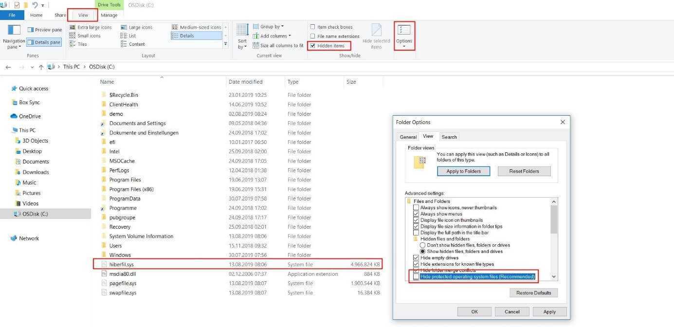 Довольно часто на диске C кончается свободное место, но пользователь не может понять, что за папка или файл имеет такой размер. Возможно, виновником отсутствия свободного места является hiberfil.sys, просто вы его не видите. Чтобы проверить его наличие, нам открыть доступ к скрытым данным.Сделать это можно следующим образом: