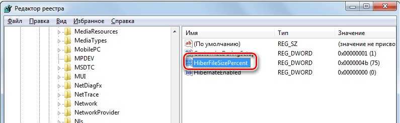 - Теперь, вернувшись в главное окошко реестра найдите и кликните дважды ЛКМ по файлу «HiberFileSizePercent»;