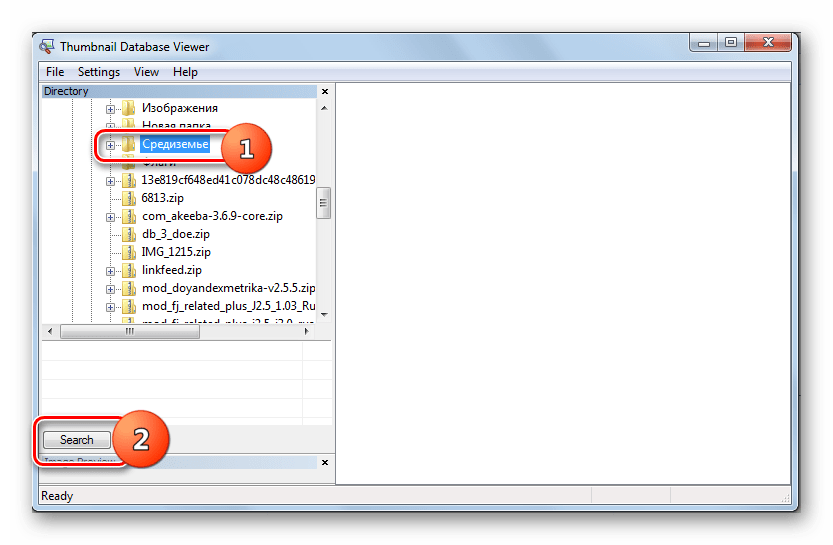 - После запуска Thumbnail Database Viewer с помощью навигационной области слева перейдите к тому каталогу, в котором находятся интересующие вас эскизы. Произведите его выделение и щелкните «Search».