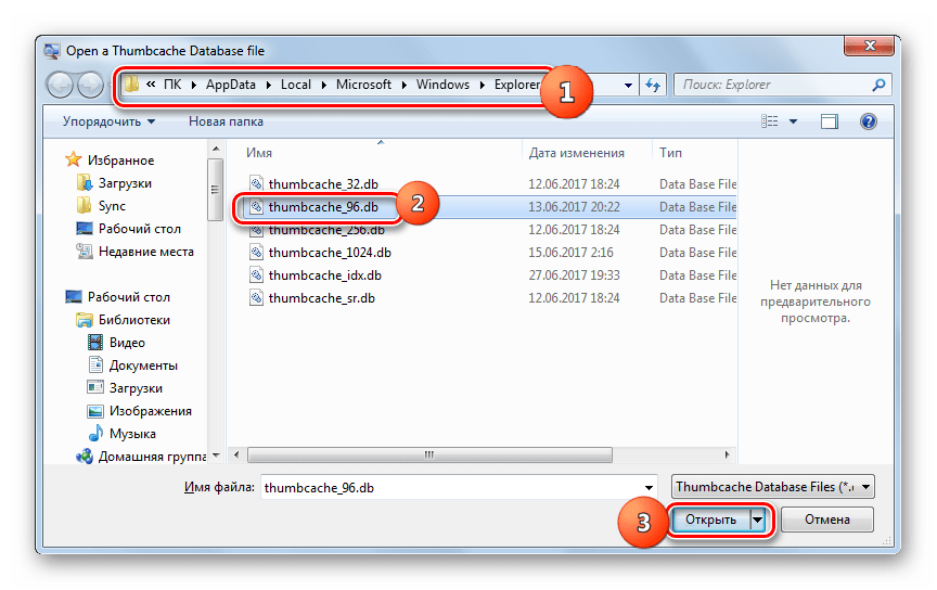 Запускается окно, в котором следует перейти в директорию расположения нужного элемента. После этого выделяем объект thumbcache_xxxx.db и жмем «Открыть».