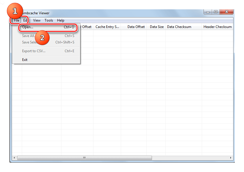 - Запустите Thumbcache Viewer. Щелкните в меню последовательно по наименованиям «File» и «Open…» или примените Ctrl+O.