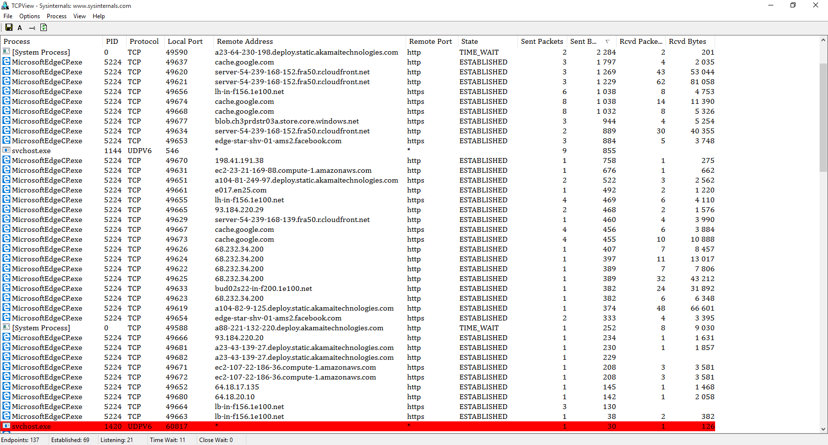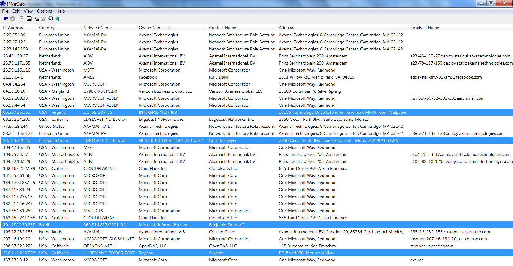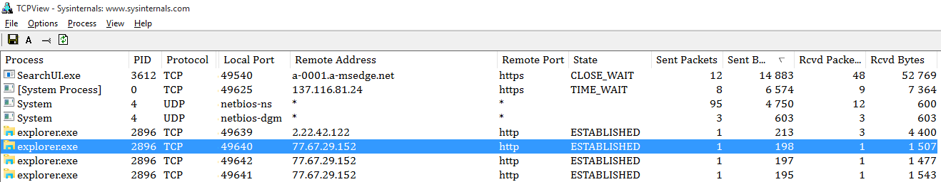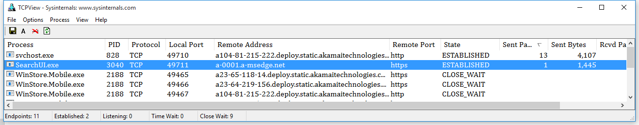По сравнению с первым логом этот выглядит скучно. На экране не уместился только один айпишник, а их общий список состоит всего из четырех. Два из них относятся к сети доставки контента и не могут эффективно блокироваться в hosts – слишком много подсетей принадлежит Akamai. Третий IP-адрес принадлежит службе Windows Update, которую не блокировали. Самым стойким шпионом оказался BingBot. Его связь с бразильской Microsoft Informatica не знает преград. Видимо, процесс содержит встроенные средства обхода ограничений.
