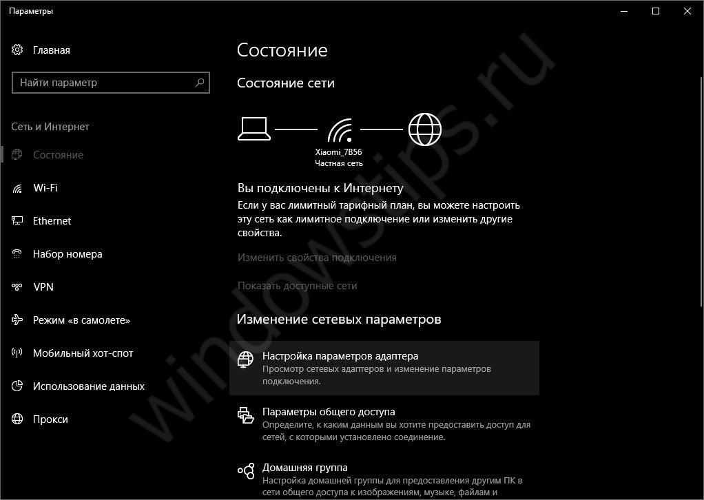 - На следующем этапе необходимо перейти в «Настройки параметров адаптера». Если вы пользуетесь Windows 7 и более ранними версиями, то этот пункт появится еще на 1 этапе. Если это Windows 10, то нужно выбрать соответствующий пункт в открывшемся окне.