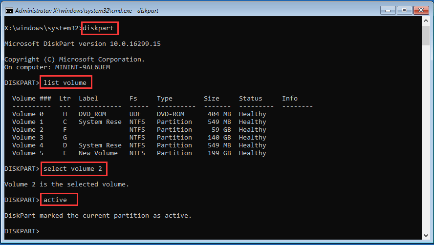 Примечание: заменить в третьей команде укажите номер диска по вашему выбору, а в пятой команде введите букву диска по вашему выбору вместо