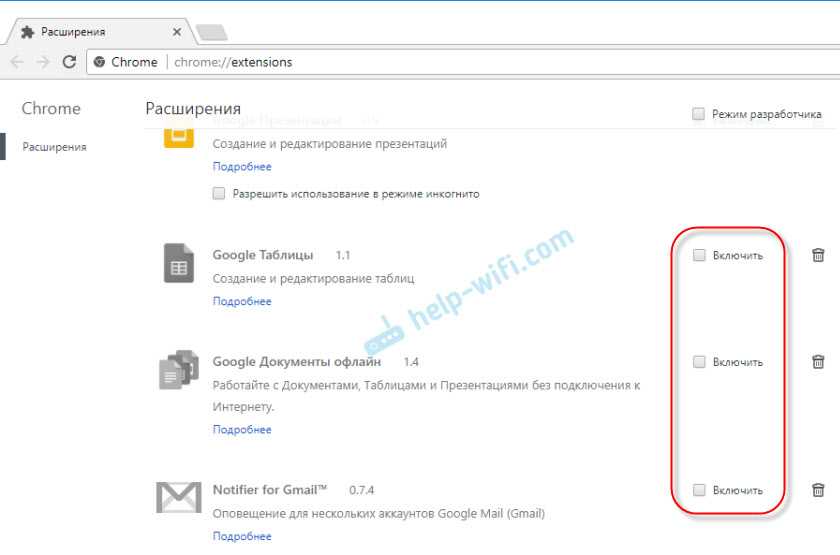 Чтобы определить проблемное расширение, сначала отключите все плагины в браузере Chrome, сняв флажок справа от них. Затем включите по одному добавочному номеру за раз и зайдите на любой сайт, чтобы проверить, появляется ли сообщение об ошибке. Повторите этот шаг для остальных расширений, пока не найдете виновника. Удалите расширение, вызывающее проблему, нажав значок мусорного ведра справа.