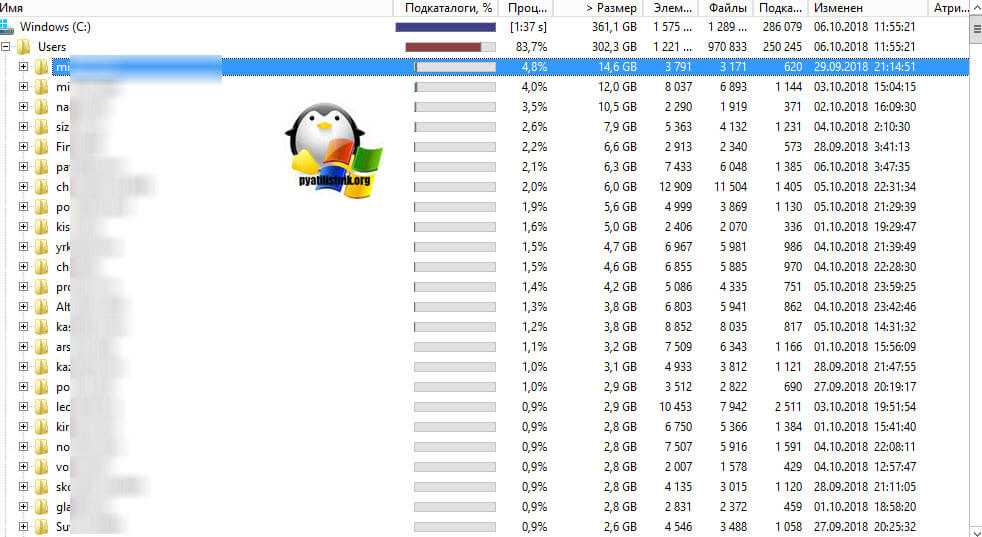 Как видим, у меня самым объемным является папка Users, второй папка Windows 45 ГБ. С правой стороны вы увидите столбец по форматам, там сразу можно выделить MP4 или MSI, видно сколько они занимают. Ниже разноцветные квадраты, это так выглядят все типы файлов на жестком диске в этой утилите.