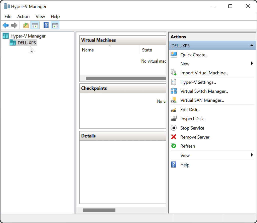 Когда откроется Диспетчер Hyper-V, выберите имя хоста вашего ПК в столбце слева.