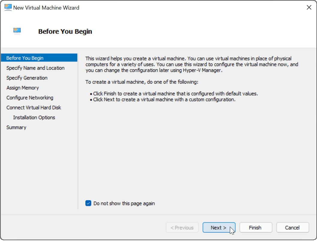 “Мастер создания новой виртуальной машины” начнет. Первый экран — это основное сообщение, позволяющее понять, для чего оно предназначено. Это общая информация, которая не влияет на вашу виртуальную машину.