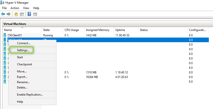 Open Hyper-V Manager -> Right-Click -> Press Settings
