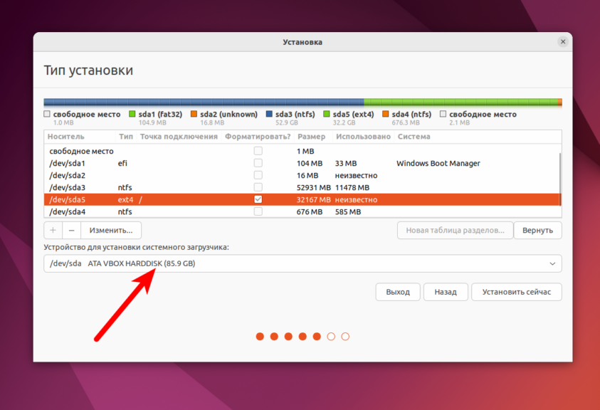 Выбрать раздел можно внизу окна с помощью пункта Устройство для установки системного загрузчика: