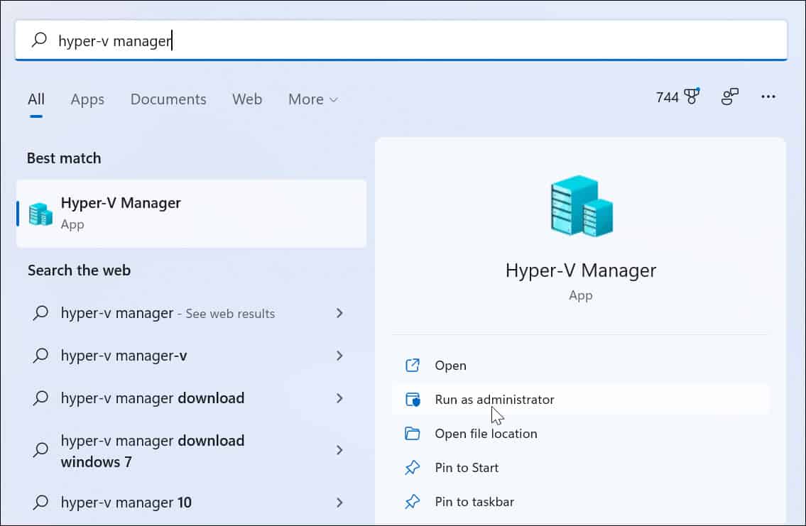 Чтобы начать, нажмите «Пуск» или нажмите клавишу Windows на клавиатуре. В меню «Пуск» введите менеджер гипервизора. Нажмите на первый результат (лучший матч) из результатов поиска вверху.