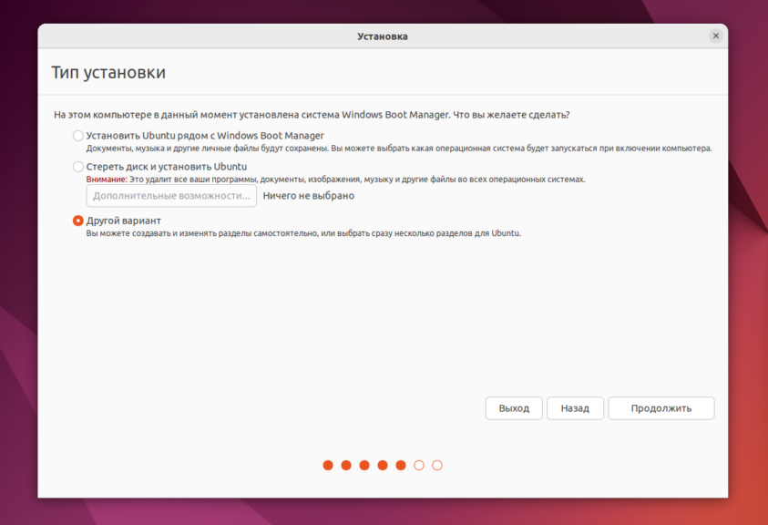 На этапе выбора способа разметки вы можете выбрать Установить Ubuntu рядом с Windows. По умолчанию выбран именно этот пункт: