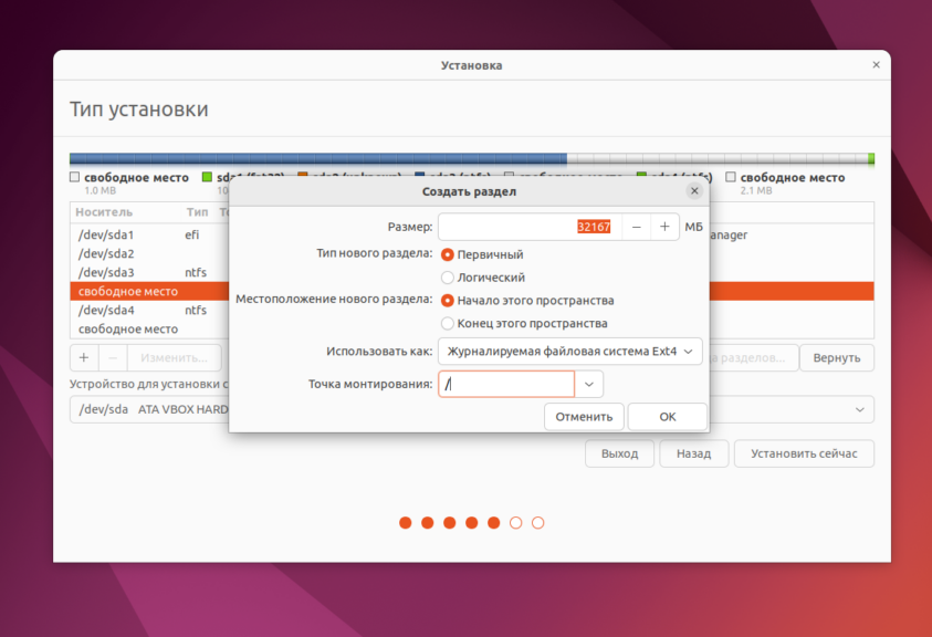 Выберите здесь Свободное пространство и нажмите на кнопку со значком плюса для того чтобы создать новый раздел. В открывшемся окне нужно только выбрать размер раздела и точку монтирования. Для корневого раздела укажите не меньше 25 гигабайт места, а лучше 50-100 гигабайт, как я писал выше. Затем укажите точку монтирования /: