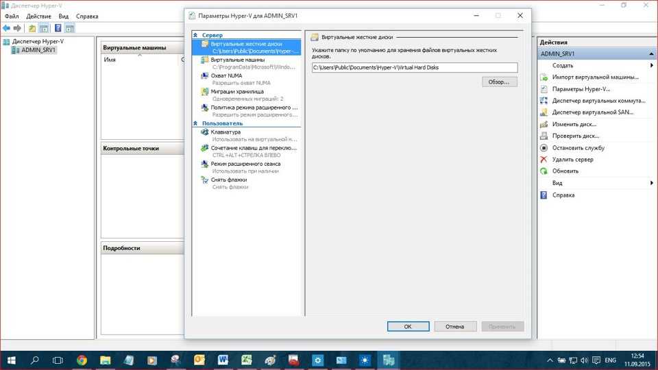 Параметры средства Hyper-V на операционной системе Виндовс десять