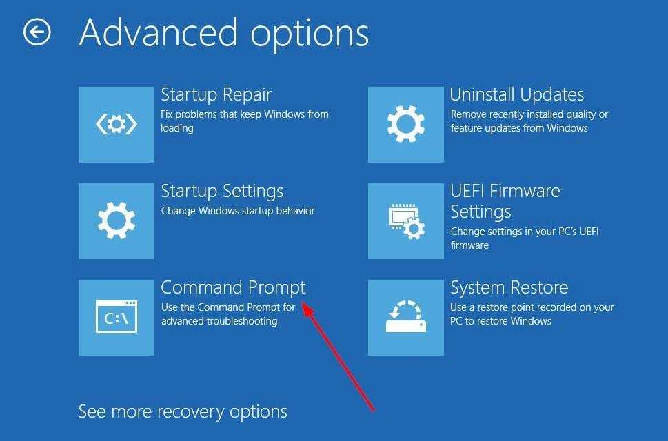 - From the Automatic Repair mode, navigate to Advanced options > Troubleshoot > Advanced options > Command Prompt.