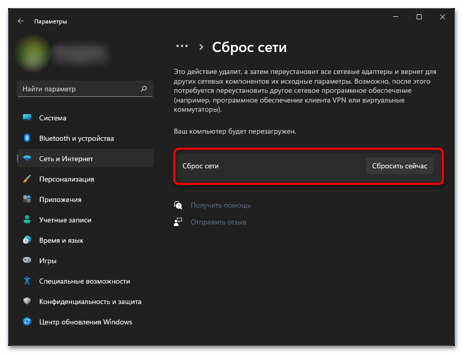 В Windows 11 через графический интерфейс можно выполнить автоматический сброс сети. Это обнулит все настройки и вернет их в состояние по умолчанию. Такой метод оптимален в тех случаях, когда ошибка 0x800704cf начала появляться после установки каких-либо программ, связанных с интернетом. Это может быть любой антивирус или VPN.