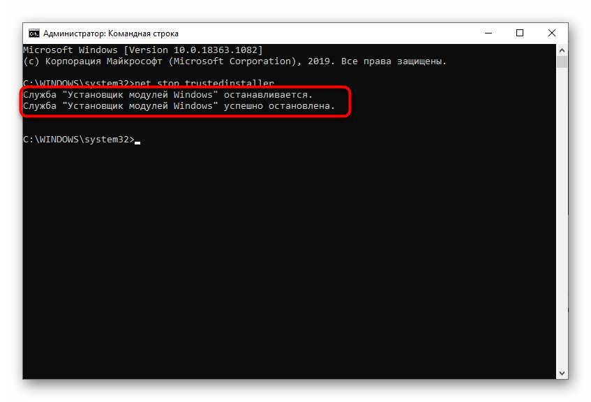 Ожидайте появления соответствующего уведомления о том, что служба успешно остановлена.