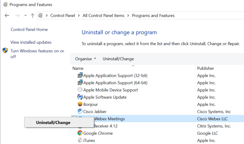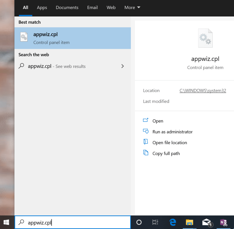 To do this type appwiz.cpl in your Windows search and press Enter. – this will launch the “Programs and Features” window.