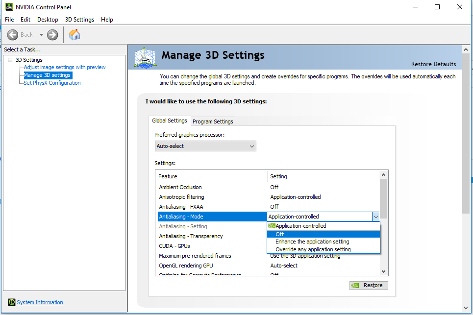 - Once in the app, select “Manage 3D settings” on the left panel, then click the “Global settings” tab on the right.