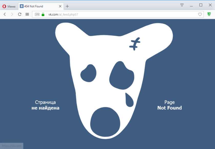 В социальной сети Вконтакте, например, страница с ошибкой 404 выглядит вот так (Page Not Found) :