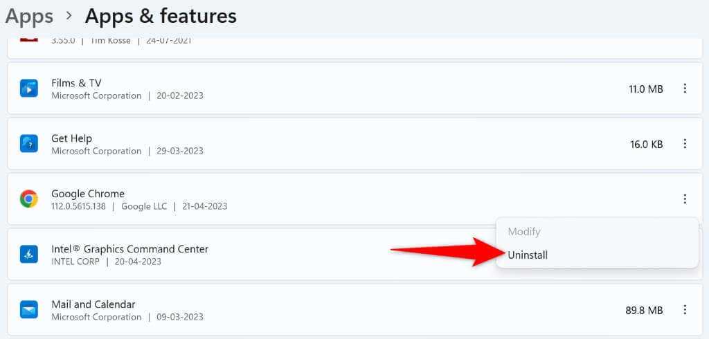 - Find Google Chrome on the app list, select the three dots next to the app, and choose Uninstall.