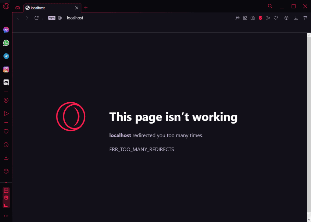 The warning notifying us of the err_too_many_redirects error on Opera is similar to the one that appears on Chrome.