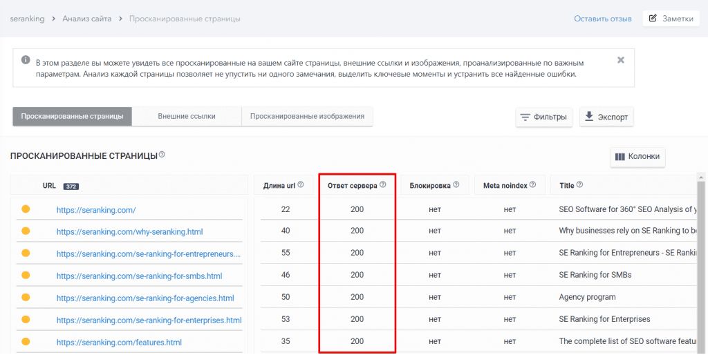 Все статусы страниц вы увидите в основном отчете, в котором проанализированы технические параметры, страницы, мета-теги, ссылки и контент.