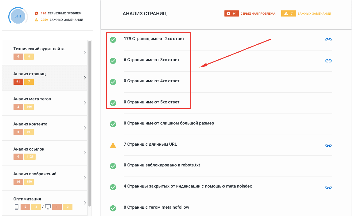 Если вы хотите быстро проверить коды состояния всех страниц вашего сайта одним кликом, обязательно попробуйте наш инструмент «Аудит сайта».