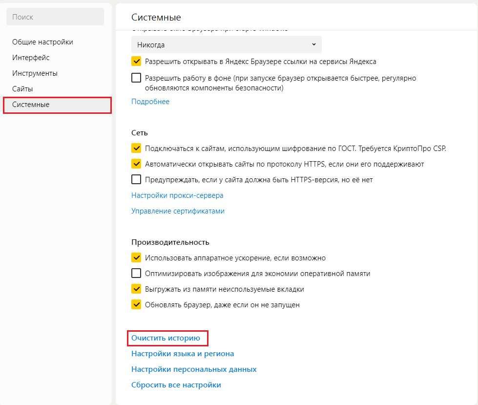 В левом меню выберите раздел «Системные», в конце страницы перейдите в «Очистить историю».
