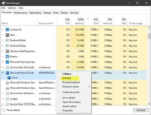 Откройте диспетчер задач, найдите WINWORD.EXE, щелкните его правой кнопкой мыши и выберите Завершить задачу. Затем повторно запустите приложение Office.