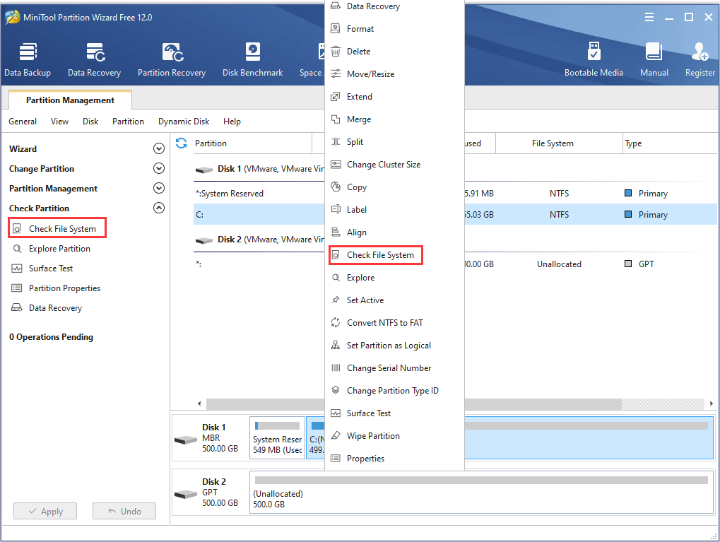 Step 2: Select the partition for which you want to perform checking disk, and then choose Check File System from the left pane to activate the feature. Also, you can right-click the feature and choose the feature from the context menu.