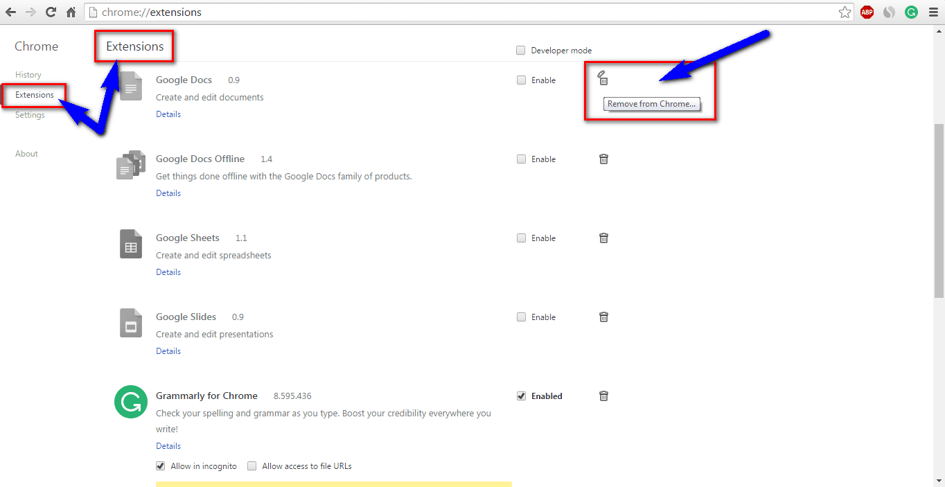 Step 2. On Extensions page, you will see all the extensions which are installed on your Chrome browser. Browse through them and look for the suspicious ones. If you find any, click on the trash bin icon in front of them. This will remove that extension.
