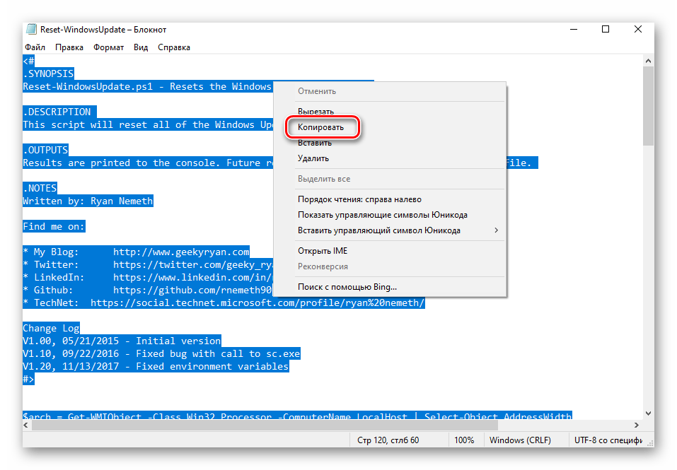 В результате будет автоматически загружен файл «Reset-WindowsUpdate.ps1». Откройте его двойным кликом левой кнопкой мыши. Его содержимое отобразится в текстовом редакторе, который назначен у вас по умолчанию. Выделите весь текст сочетанием клавиш «Ctrl+A», затем нажмите на любом участке правой кнопкой мыши и выберите из контекстного меню пункт «Копировать».