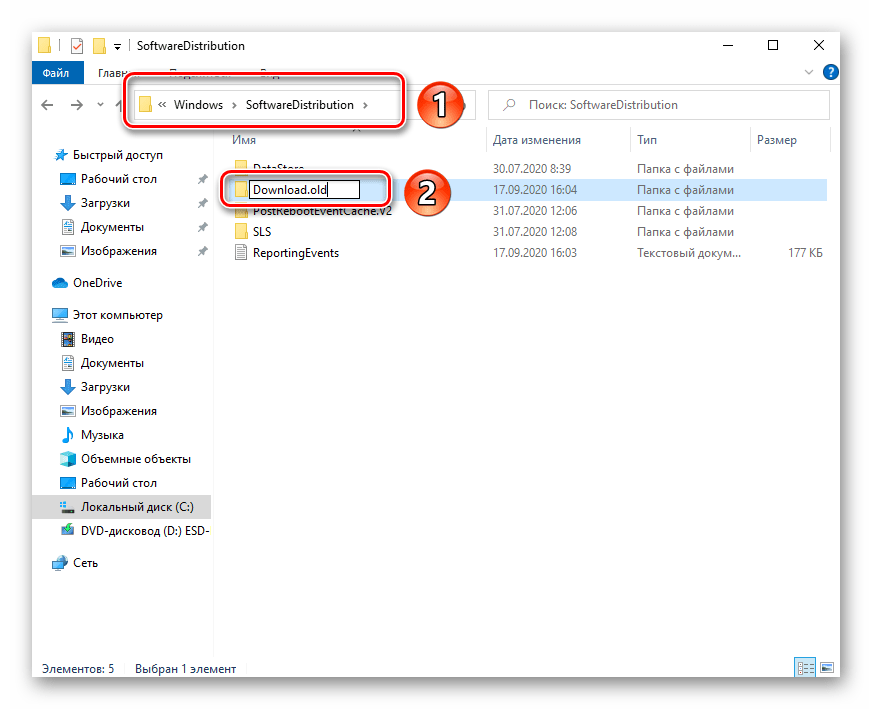 Внутри директории «SoftwareDistribution» вы найдёте папку «Download», которую следует переименовать в «Download.old». Для этого выделите её одиночным кликом ЛКМ, после чего нажмите «F2». Введите указанное название, затем нажмите «Enter».