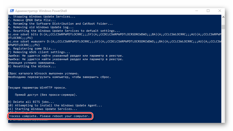 Если всё сделано верно, через некоторое время вы увидите надпись об успешном завершении операции в нижней части окна «PowerShell». Вам порекомендуют перезагрузить систему, но не спешите это делать. Предварительно нужно выполнить несколько дополнительных действий. На данном этапе можно закрыть окно утилиты.