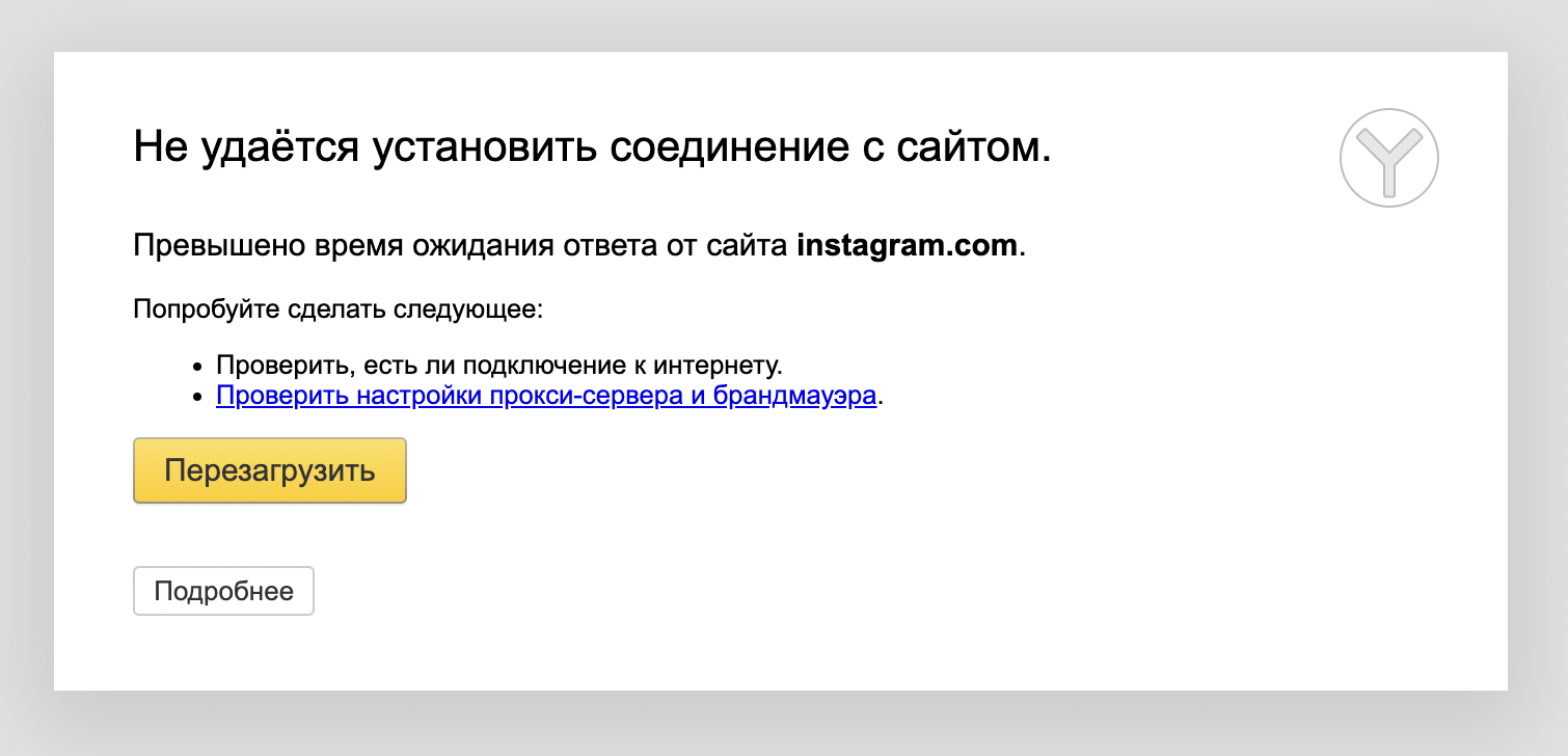 Можно попробовать опять соединиться с сайтом, нажав кнопу Обновить текущую страницу. Если не получается — почистить кэш, выключить и включить браузер, проверить подключение к Интернету.