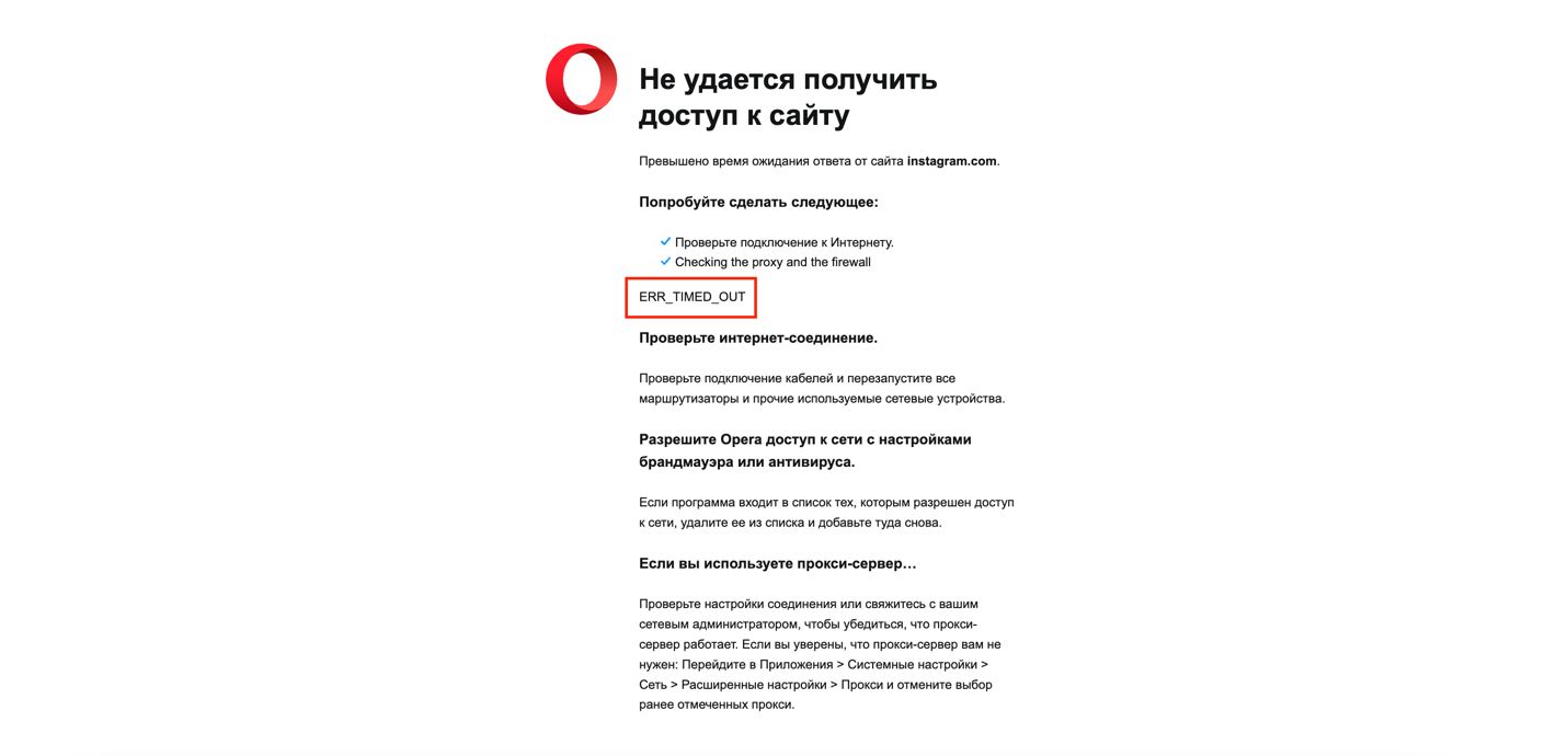 Если вы работаете под VPN, отключите программу или расширения и проверьте подключение. Если у вас операционная система Windows, проверьте, не стоит ли в настройках подключение через прокси-сервер. Если работоспособность ресурса не восстановилась, переходите дальше.