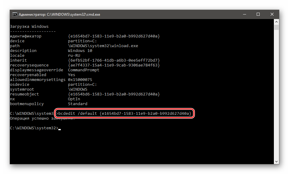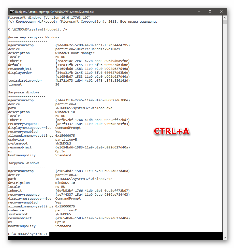 Подробнее: Как запустить «Командную строку» в Windows 10 Получаем информацию обо всех записях в хранилище диспетчера загрузки. Вводим команду, указанную ниже, и нажимаем ENTER.