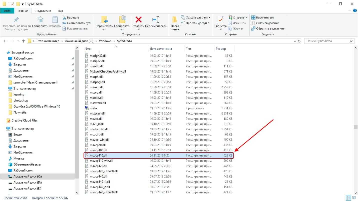 Открываем папку C:\Windows\SysWOW64 через любой проводник и находим файл «msvcp110.dll».